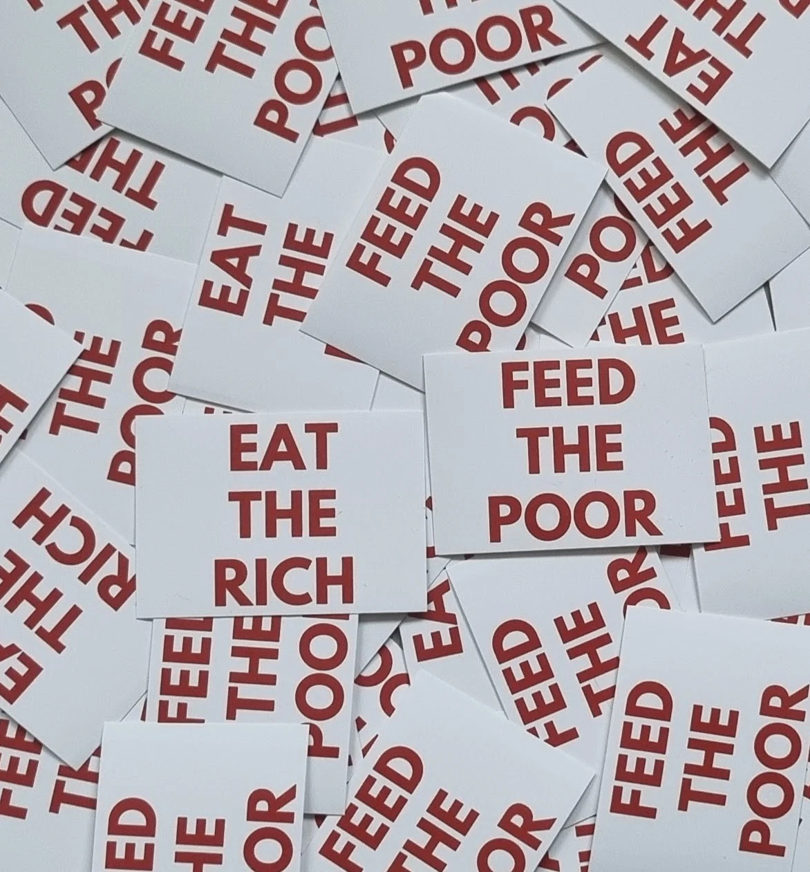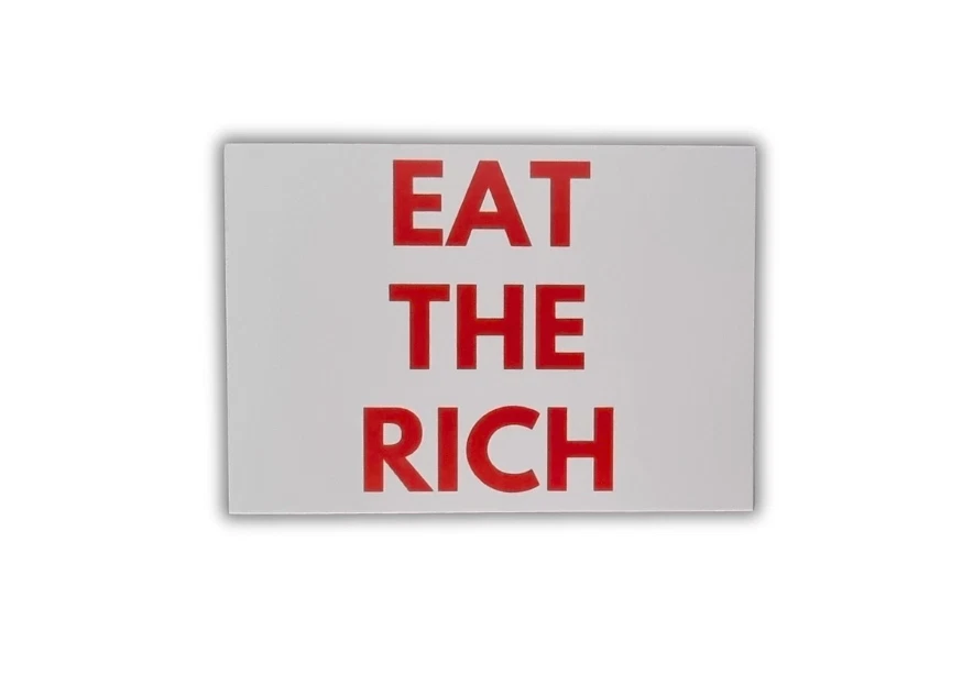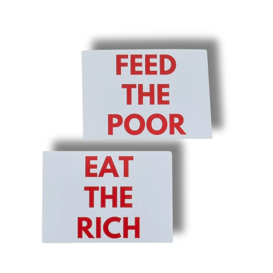 Beim Kauf erhalten sie 100 der abgebildeten Aufkleber (50x “Eat The Rich” + 50x “Feed The Poor” Sticker). Die Aufkleber besitzen eine Schicht die vor Ausbleichung und Regen schützt und kommen mit Knicken/ Schlitzungen zur leichten und schnellen Anbringung.