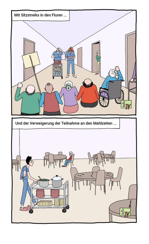 Ausgangspunkt der Geschichte ist ein Fernsehbericht über eskalierende Proteste in einem Pflegeheim, der in einem Wohnzimmer eine hitzige Diskussion entfacht: Sollte man „die schicken Karren anzünden“ oder ist ziviler Ungehorsam der wirksamere Weg? Statt moralischer Schwarz-Weiß-Malerei geht es um die Frage nach der tatsächlichen Effektivität von Protestformen. Inspiriert von den Forschungen der Politikwissenschaftlerinnen Erica Chenoweth und Maria J. Stephan, die zu dem Ergebnis kommen, dass gewaltlose Bewegungen historisch erfolgreicher sind als gewaltsame, lässt Loos unterschiedliche Perspektiven aufeinandertreffen. Im Verlauf des Gesprächs tauchen einflussreiche Denkerinnen und Aktivistinnen wie Mahatma Gandhi, Martin Luther King Jr., Gene Sharp, Saul Alinsky und Frances Fox Piven auf und bringen wissenschaftliche Erkenntnisse, Strategien des zivilen Ungehorsams und Erfahrungen aus sozialen Bewegungen mit ein. So entsteht ein spannender Mix aus Sachbuch, Erklärcomic und gesellschaftspolitischer Auseinandersetzung.